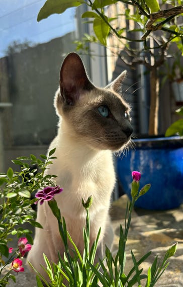 Amy is een heel zachtaardig poesje met de welbekende Siamezen stem. Ze vindt alles leuk en interessant en komt gelijk kijken als er wat nieuws te beleven valt.